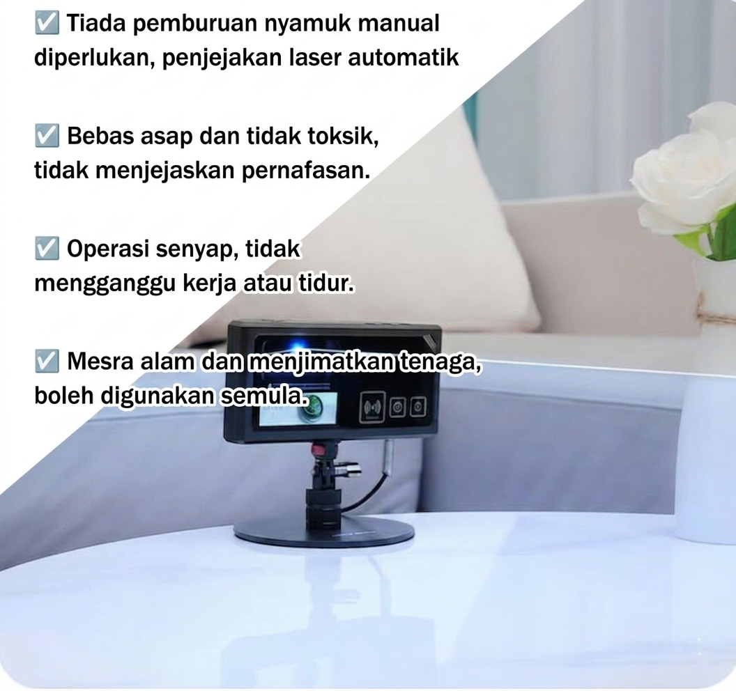 1️⃣ Teknologi Canggih: Laser matriks foton untuk pembasmian nyamuk – Sasaran dikesan dengan ketepatan milisaat – Senyap & selamat digunakan